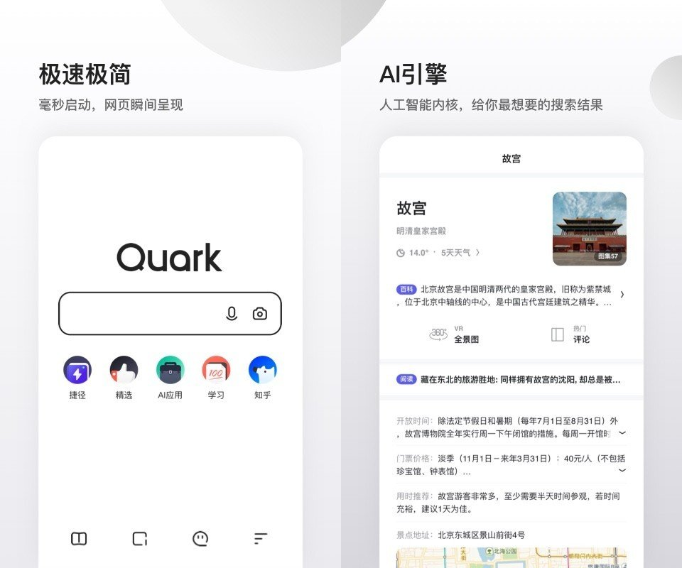 夸克是阿里巴巴旗下的智能浏览器 以前的夸克不仅UI好看,并且用起来也很流畅。但是现在安装包越来越大,软件也越来越臃肿,已经不再是当初那个追求极简的夸克了