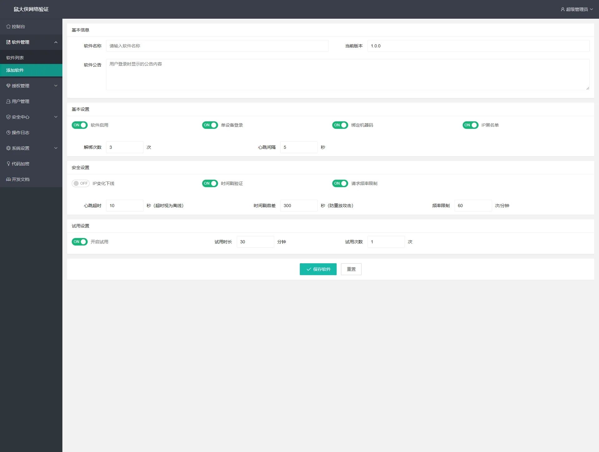 鼠大侠网络验证系统是一套轻应用的软件授权验证解决方案,专为软件开发者设计。采用PHP+MySQL架构,支持一机一码授权、福利码激活、试用功能、心跳检测等,帮助开发者轻松实现软件的授权管理和防破解保护。